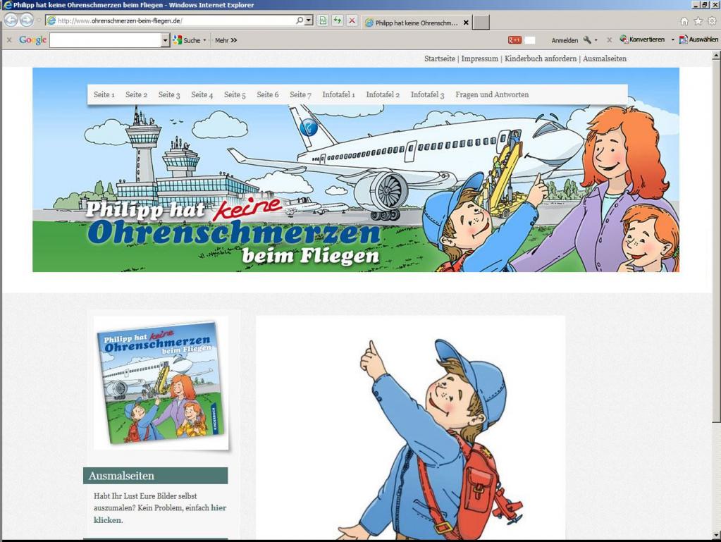 Das Vorlesebuch, eine Idee der Innosan GmbH, ist an das bekannte quadratische Kinderbuchformat (10 x 10 cm) angelehnt. Es erzählt die Geschichte von Philipp, der gemeinsam mit seiner Familie in den Urlaub fliegt und dabei Angst vor Ohrenschmerzen während der Landung hat. Dank der SANOHRA fly Ohrenstöpsel bleibt Philipps Flugreise schmerzfrei und dem erholsamen Urlaub am Meer steht nichts mehr im Weg. Das Kinderbuch bietet zusätzliche Informationen rund um das Fliegen, dem Ohr und Ohrenschmerzen beim Fliegen. Kinder und Eltern erhalten Philipps Abenteuer seit März 2012 kostenlos auf allen Flügen mit TUIfly. Ab April 2012 werden sie an Bord von Condor verteilt und ab Juni 2012 an Passagiere von airberlin. Gleichzeitig sind auf den Flügen der Airlines SANOHRA fly Ohrenstöpsel in zwei Größen für Erwachsene und Kinder ab einem Jahr erhältlich. SANOHRA fly ist einfach einzusetzen und durch das weiche Material angenehm zu tragen.