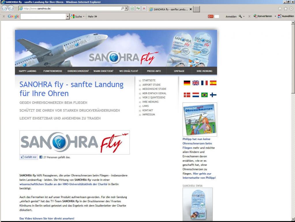 SANOHRA fly hilft Passagieren, die unter Ohrenschmerzen beim Fliegen insbesondere beim Landeanflug - leiden. Die Wirkung von SANOHRA fly wurde in einer wissenschaftlichen Studie an der HNO-Universitätsklinik der Charité in Berlin bestätigt.